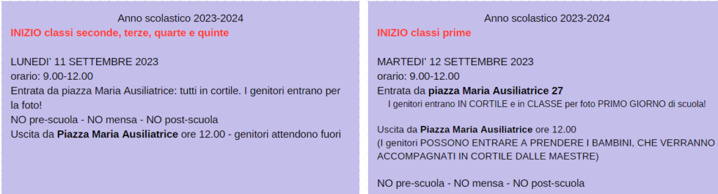 Inizio lezioni classi prime: MARTEDI’ 12 SETTEMBRE – orario 9.00-12.00 no pre-scuola, no mensa, no post-scuola – da mercoledì 13 settembre orario 8.10-16.00 con la mensa ed eventuale possibilità di pre-scuola e post-scuola. Nelle giornate di mercoledì e giovedì pomeriggio (ore 14.00-16.00) i bambini delle due classi prime parteciperanno a lezioni aperte di alcuni laboratori dell’offerta extra-curricolare. Venerdì 15/9 le lezioni terminano alle ore 12.30.